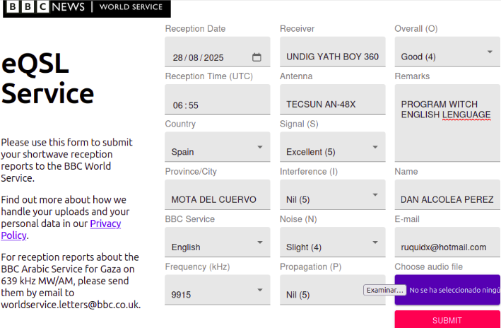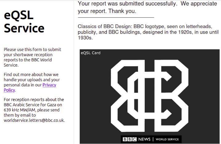 Llevaba dos años sin realizar un informe de recepción a la BBC en Onda Corta a través de ese sistema automático donde te da una e-QSL instantánea y supuestamente manda el reporte a la estación, no me apasiona esta QSL pero bueno menos es nada, ya hacen mas que otras estaciones del estilo (Radio France o DW).